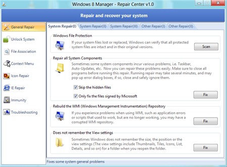 Các lỗi được phân loại theo các tiêu chí như: General Repair (lỗi thường gặp), Unlock System (lỗi hệ thống), File Association (lỗi định dạng file),Icon Repair (lỗi về icon),… Bạn chỉ việc chọn lỗi hệ thống đang gặp phải và nhấn nút Fix kế bên để tiến hành sửa chữa.